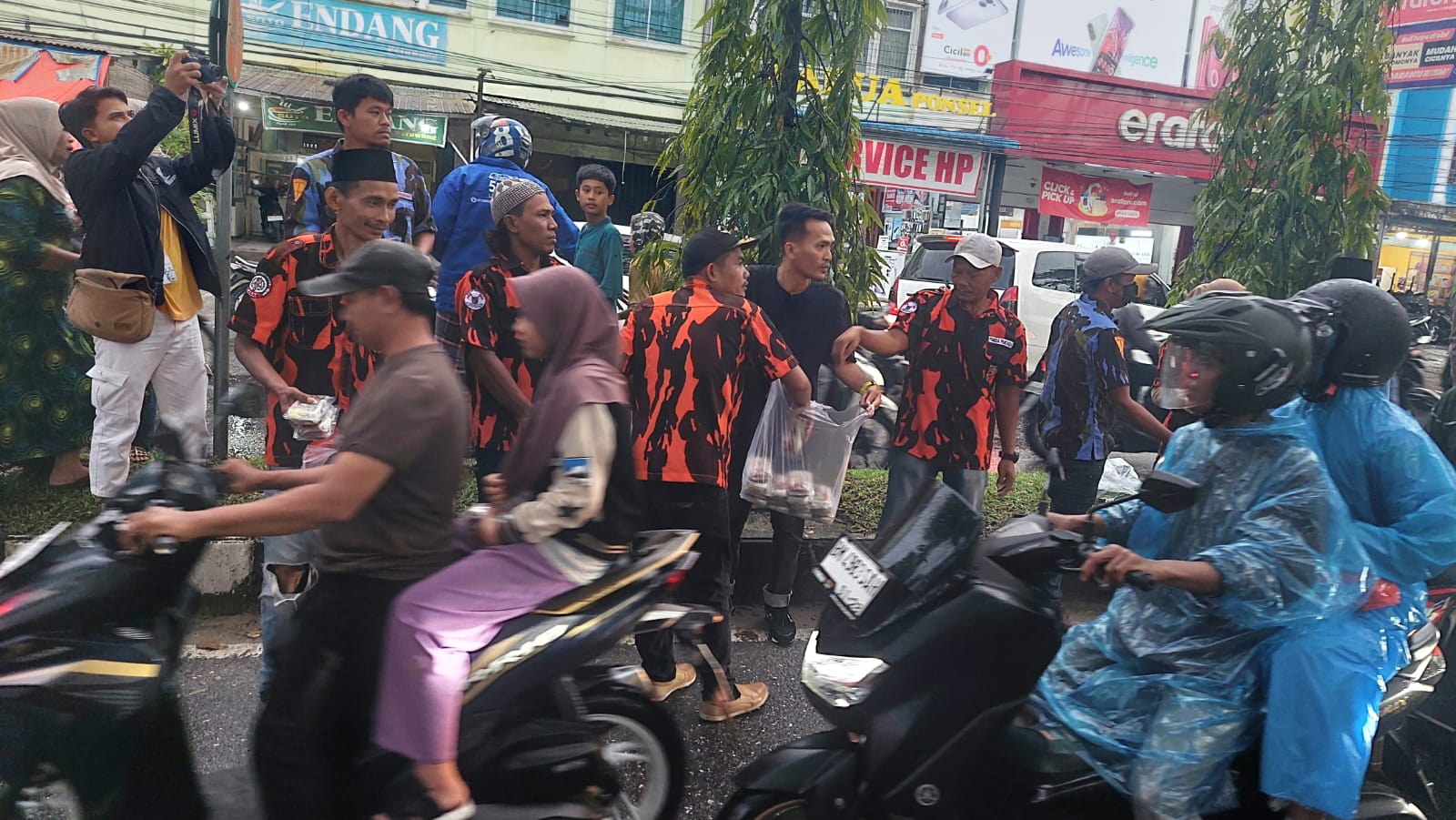 Selain menyuarakan dukungan, aksi ini juga dimanfaatkan untuk berbagi takjil kepada masyarakat yang melintas di sepanjang jalan tempat mereka melakukan orasi. Ruswanda menjelaskan bahwa kegiatan berbagi takjil ini merupakan inisiatif murni dari gabungan organisasi dan pemuda di Kecamatan Tualang, sebagai bentuk kepedulian terhadap sesama di bulan Ramadan.