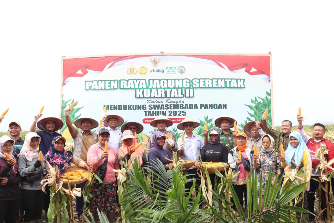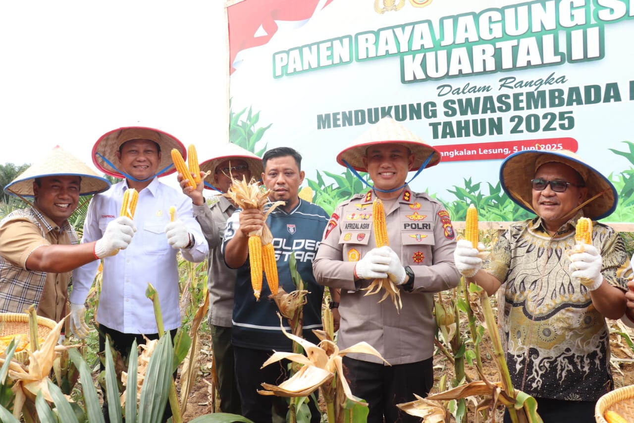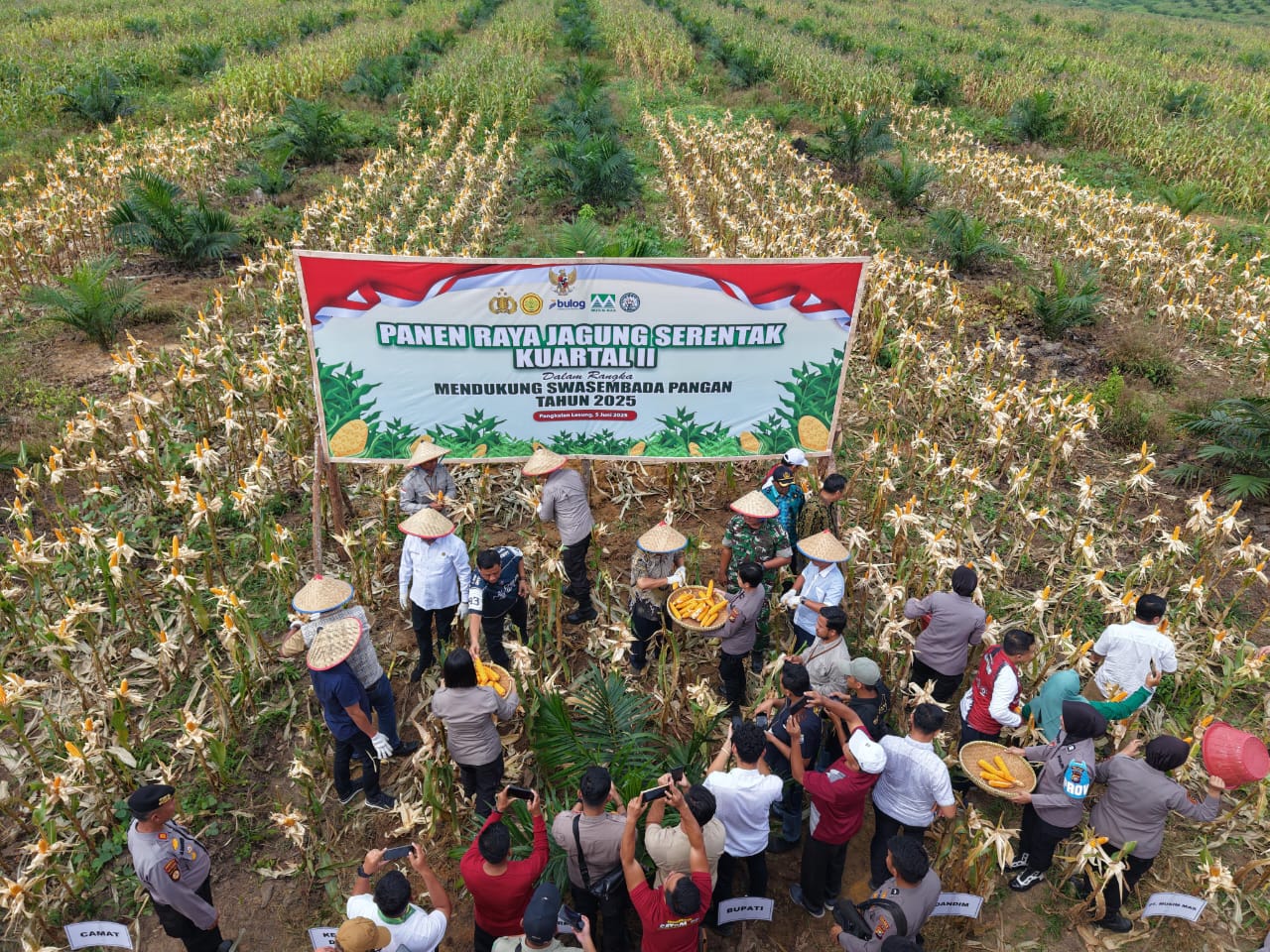 PELALAWAN, CATATANRIAU.COM, — Komitmen nyata terhadap program swasembada pangan nasional kembali terlihat di Kabupaten Pelalawan, Kamis (5/6/2025). Kapolres Pelalawan AKBP Afrizal Asri, SIK hadir langsung dalam Panen Raya Jagung Serentak di kebun jagung Tumpang Sari PT Musim Mas Estate I, Desa Pesaguan, Kecamatan Pangkalan Lesung.