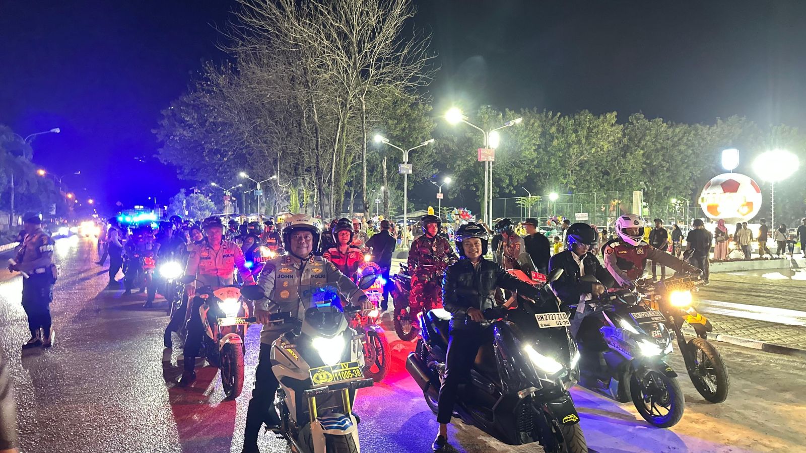 Patroli gabungan ini melibatkan sekitar 70 unit sepeda motor dan 30 unit mobil patroli dengan rute mengelilingi sejumlah titik strategis, mulai dari Taman Bola Jalan Maharaja Indra, Komplek Bhakti Praja, Jembatan Kembar, Masjid Agung Ulul Azmi Islamic Center, Tugu Bono, SMAN Bernas, hingga kembali ke Jalan Lintas Timur.