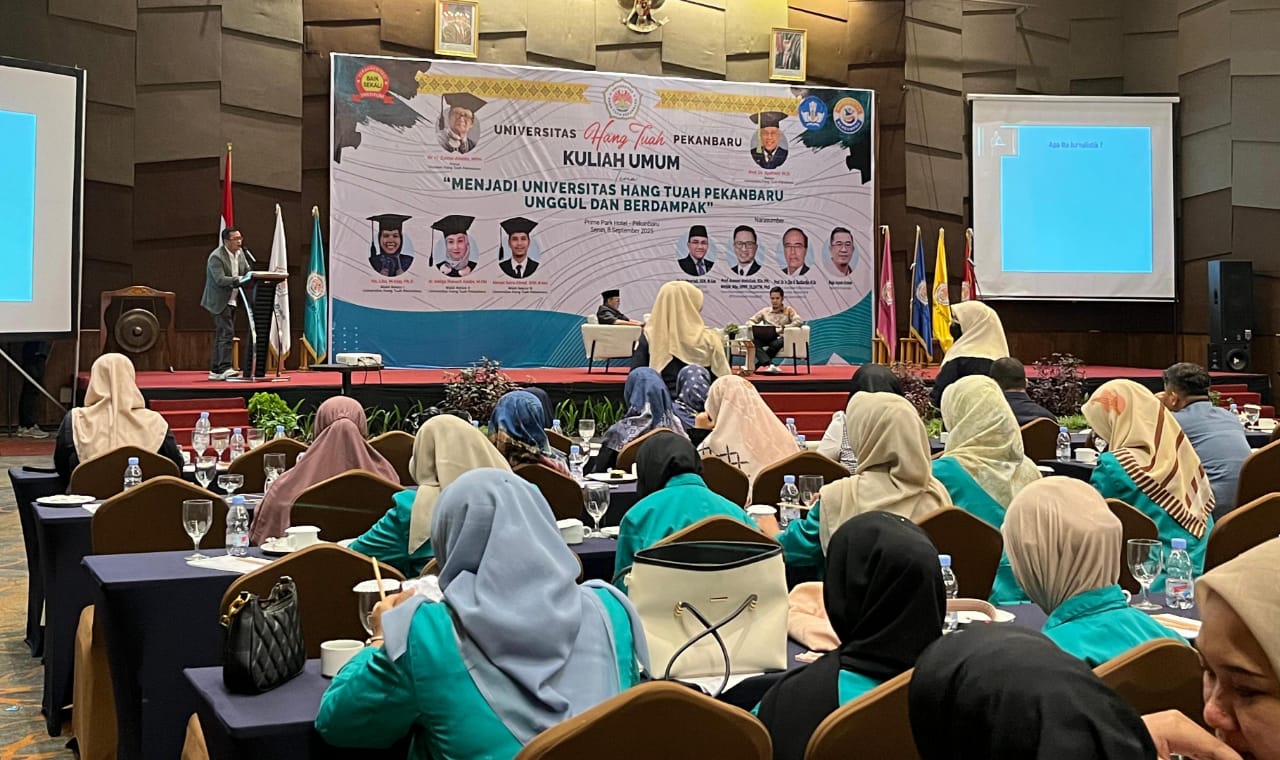 PEKANBARU, CATATANRIAU.COM – Ketua Persatuan Wartawan Indonesia (PWI) Provinsi Riau, Raja Isyam Azwar, hadir sebagai pemateri dalam Kuliah Umum Universitas Hang Tuah Pekanbaru, Senin (8/9/2025). Dalam kesempatan itu, ia menegaskan pentingnya peran jurnalis di tengah arus digitalisasi yang kian deras.