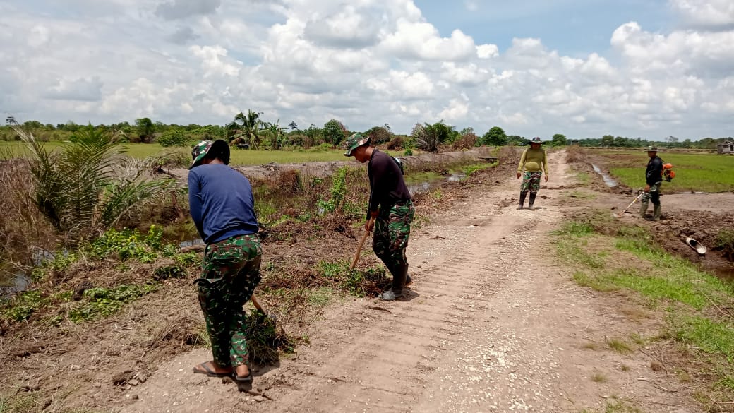 Kegiatan ini merupakan bagian dari upaya percepatan pembangunan infrastruktur pedesaan serta mendukung peningkatan kesejahteraan masyarakat, khususnya di sektor pertanian. Sejak pagi hari, para personel TNI dan warga setempat terlihat kompak melakukan pembersihan sisa rumput, tanah, serta material yang menghambat proses semenisasi jalan, sekaligus menata lahan sawah agar siap untuk tahap pengolahan berikutnya.