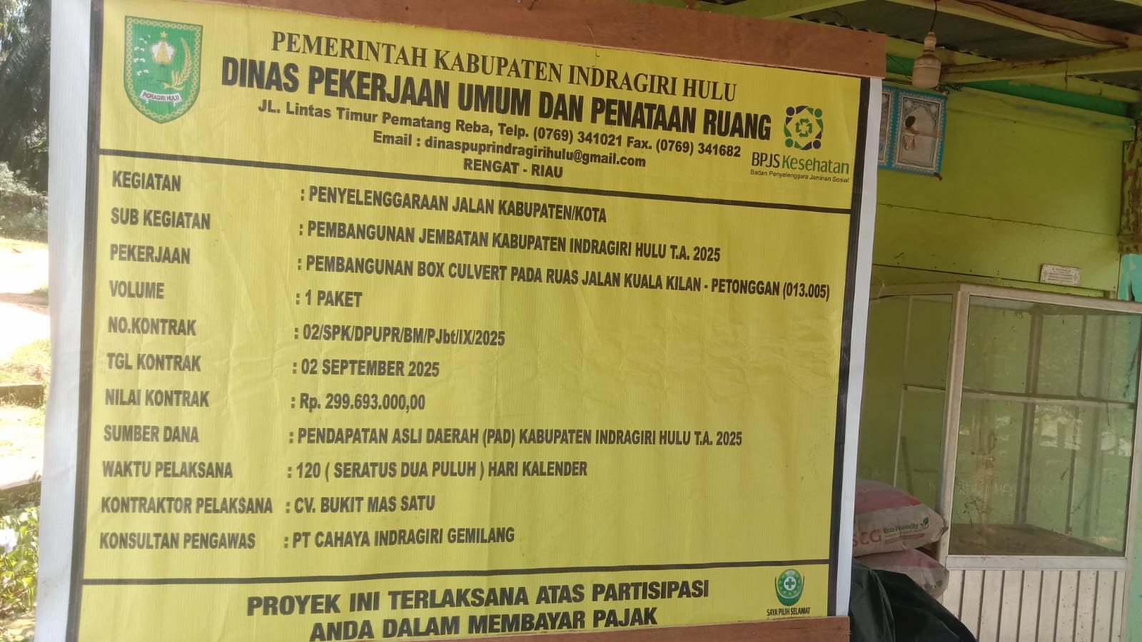 Proyek Box Culvert tersebut diketahui menggunakan dana dengan nilai pagu sebesar Rp 299.693.000, yang bersumber dari APBD Kabupaten Indragiri Hulu tahun anggaran 2025.***