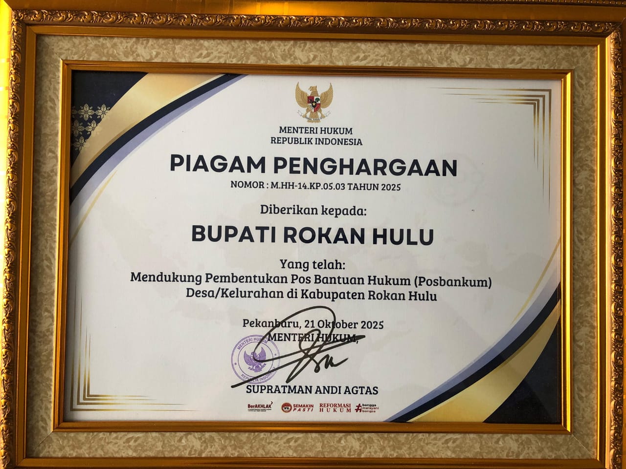 Penghargaan tersebut diserahkan secara resmi pada acara Peresmian Pos Bantuan Hukum dan Penandatanganan Perjanjian Kerjasama yang digelar di Aula Balai Serindit, Gubernuran Riau, dengan dihadiri jajaran pejabat dari Kementerian Hukum dan HAM Republik Indonesia serta berbagai unsur terkait. Selasa (21/10/2025).