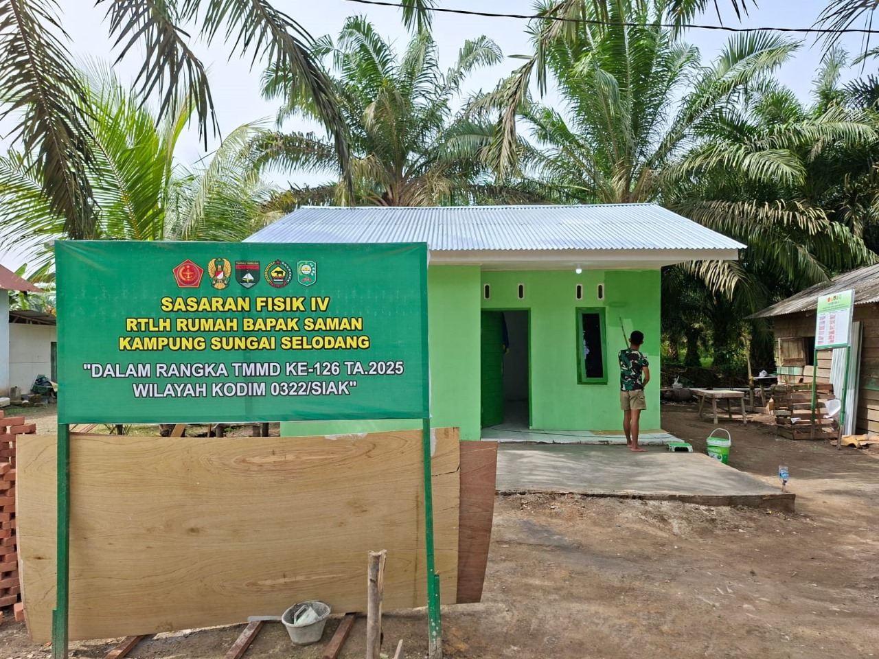 Di Kampung Sungai Selodang, Kecamatan Sungai Mandau, rumah milik Bapak Saman yang menjadi sasaran RTLH kini telah berdiri kokoh dengan tampilan baru berwarna hijau cerah. Pengecatan tahap akhir dilakukan oleh anggota Satgas TMMD bersama masyarakat. Rumah tersebut kini terlihat layak huni dan menjadi bukti nyata kolaborasi antara TNI dan warga dalam meningkatkan kesejahteraan masyarakat desa.