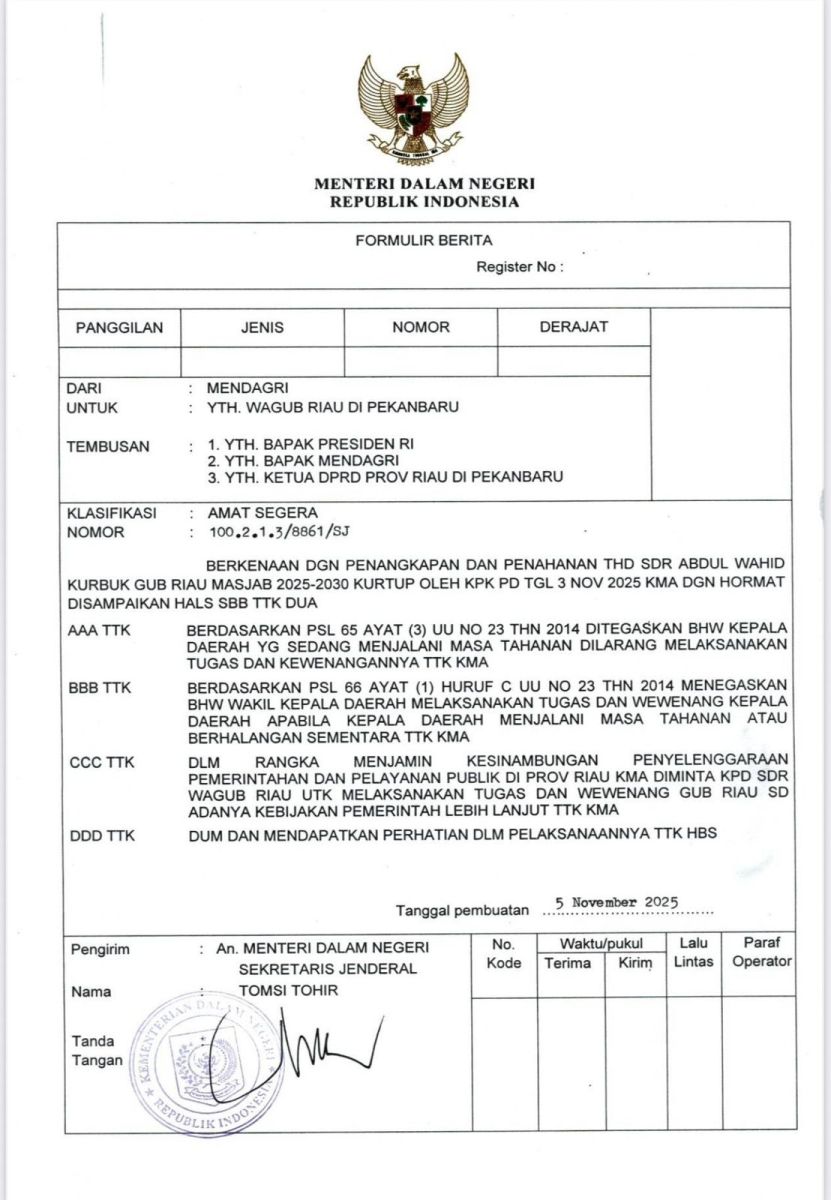 Penunjukan tersebut tertuang dalam surat bernomor 100.2.1.3/8861/SJ tertanggal 5 November 2025, dengan klasifikasi “Amat Segera”. Surat tersebut diterbitkan menyusul penangkapan dan penahanan Gubernur Abdul Wahid oleh KPK pada 3 November 2025.