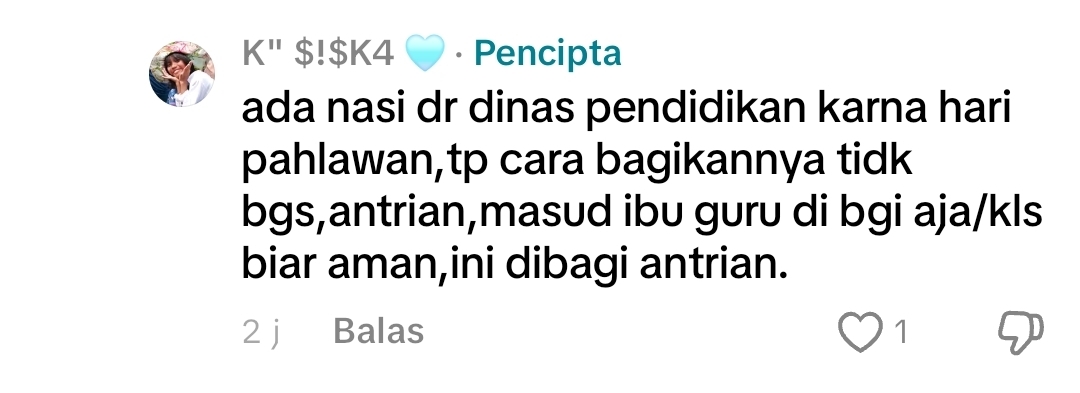 “Ada nasi dari Dinas Pendidikan karena Hari Pahlawan, tapi cara bagikannya tidak bagus, antrian. Maksud ibu guru dibagi aja per kelas biar aman, ini dibagi antrian,” tulis akun @K" $!$K4 ???? dalam kolom komentar.