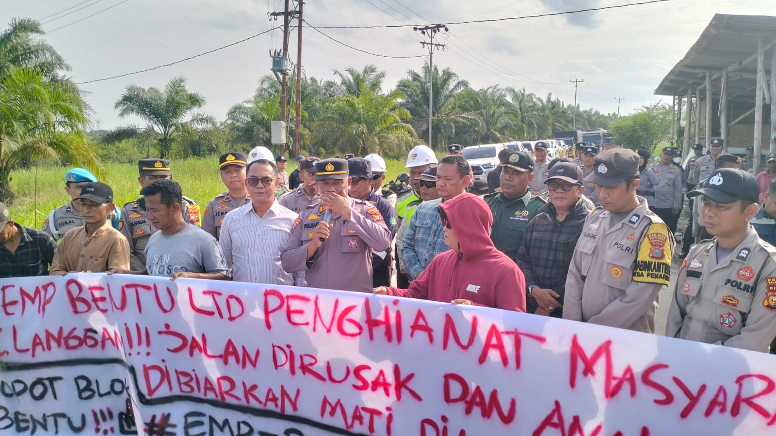 “Kami menuntut PT EMP Bentu Ltd untuk memperbaiki dan mengaspal seluruh jalan Langgam–Lubuk Ogung–Muara Sako yang digunakan untuk operasional perusahaan. Jangan ada lagi jalan rusak yang menyengsarakan rakyat,” tegas Rendi di hadapan peserta aksi.