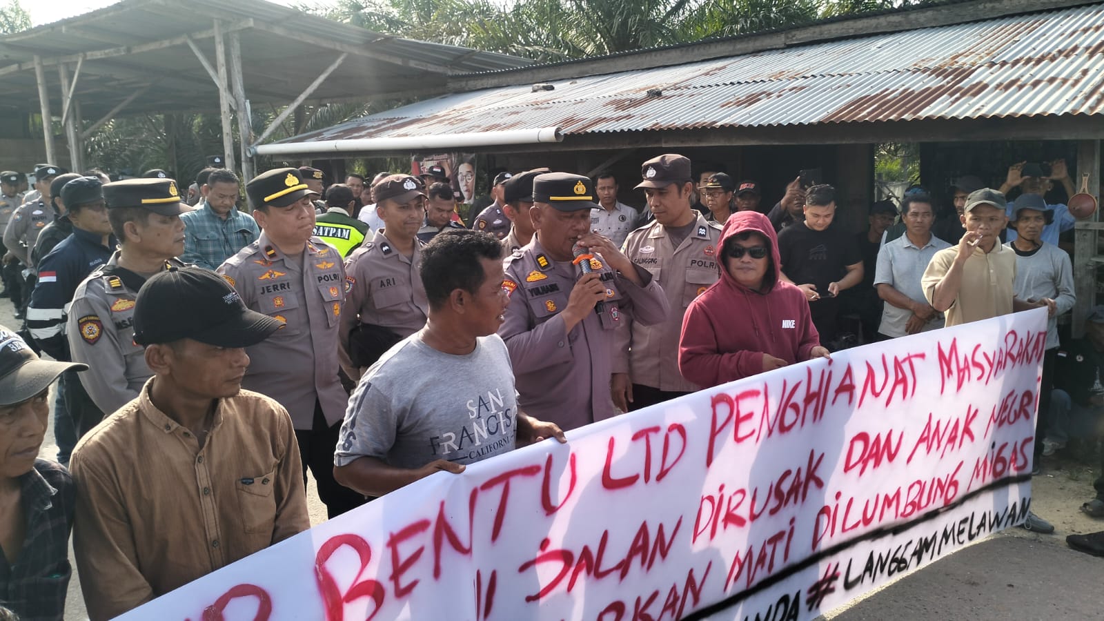 Puluhan massa yang tergabung dalam AMM-KL turun ke jalan dengan membawa spanduk dan membacakan delapan poin tuntutan. Aksi berlangsung tertib di bawah pengamanan ketat aparat gabungan dari Polres Pelalawan, Polsek Langgam, serta unsur TNI.