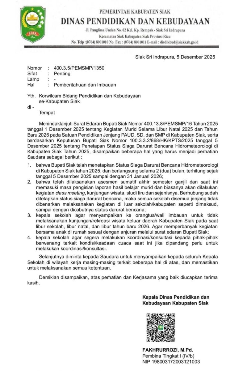 Surat imbauan tersebut ditandatangani langsung oleh Kepala Dinas Pendidikan dan Kebudayaan Kabupaten Siak, Fakhrurrozi, M.Pd, dan tertuang dalam surat bernomor 400.3.5/PEMSMP/1350 tertanggal 5 Desember 2025, yang ditujukan kepada Koordinator Wilayah Kecamatan Bidang Pendidikan dan Kebudayaan se-Kabupaten Siak.