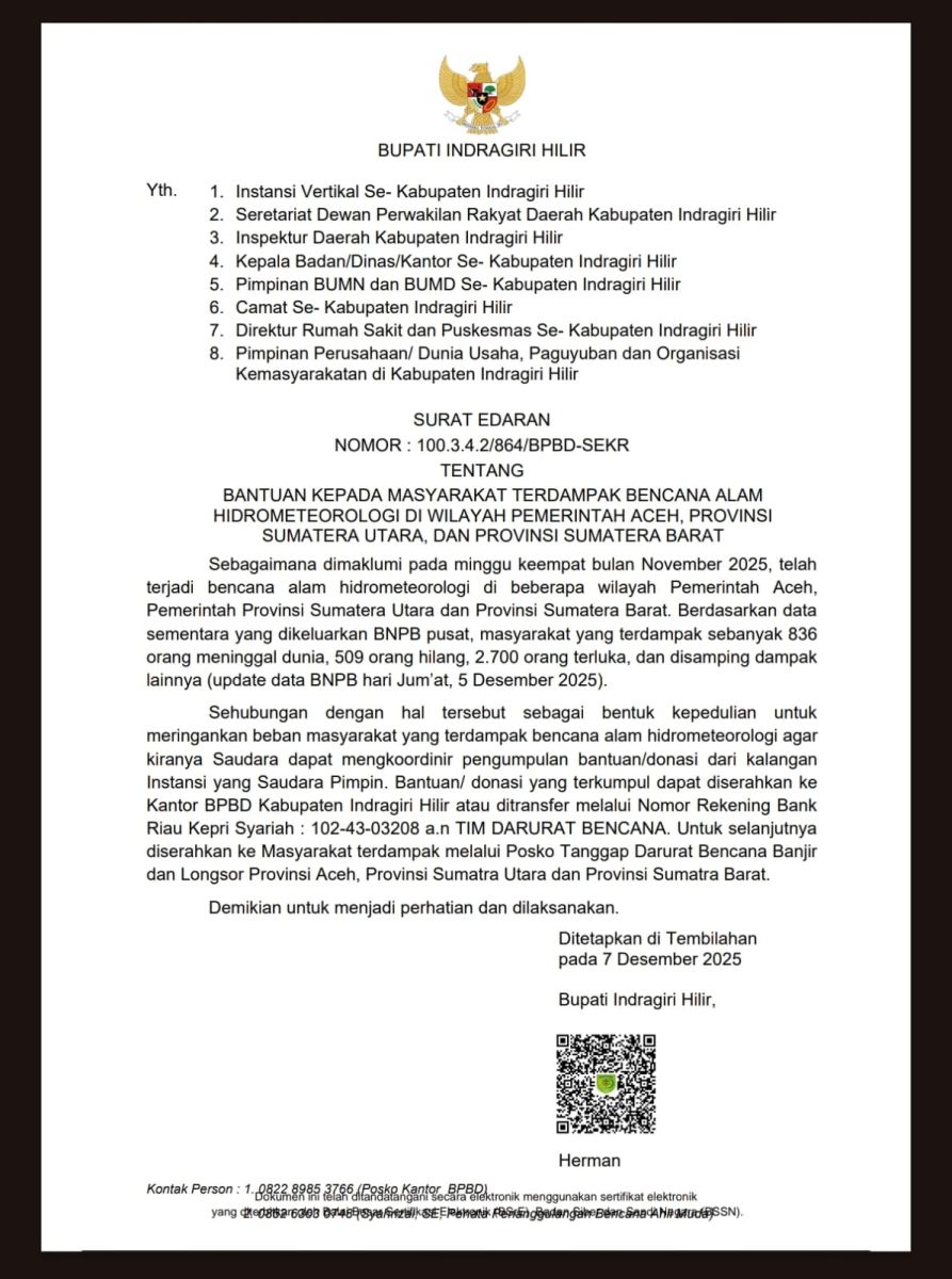 “Atas nama Pemerintah Kabupaten Indragiri Hilir, saya mengajak seluruh instansi dan elemen masyarakat untuk menunjukkan kepedulian kita dengan memberikan bantuan kepada saudara-saudara kita yang sedang tertimpa musibah,” tegas Bupati Herman dalam edaran tersebut.