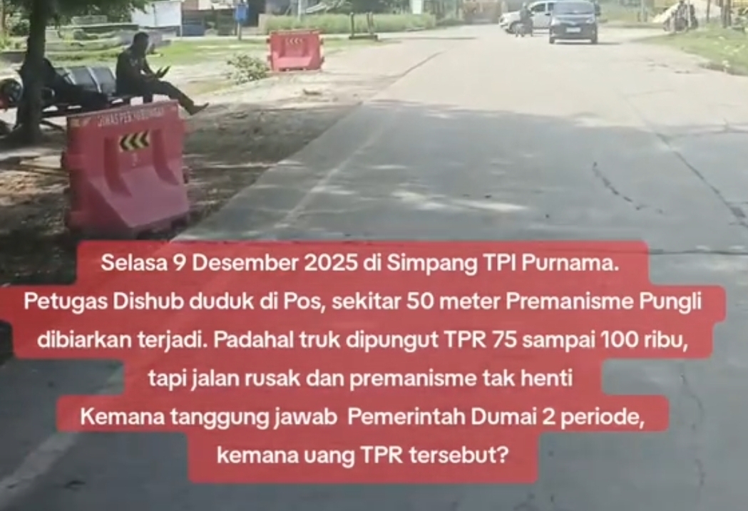 Dalam video itu juga tertulis keterangan: “Selasa 9 Desember 2025 di Simpang TPI Purnama. Petugas Dishub duduk di pos sekitar 50 meter. Premanisme pungli dibiarkan terjadi. Padahal truk dipungut TPR Rp75–100 ribu. Jalan rusak dan premanisme tak henti. Ke mana tanggung jawab Pemerintah Dumai dua periode, ke mana uang TPR tersebut?”