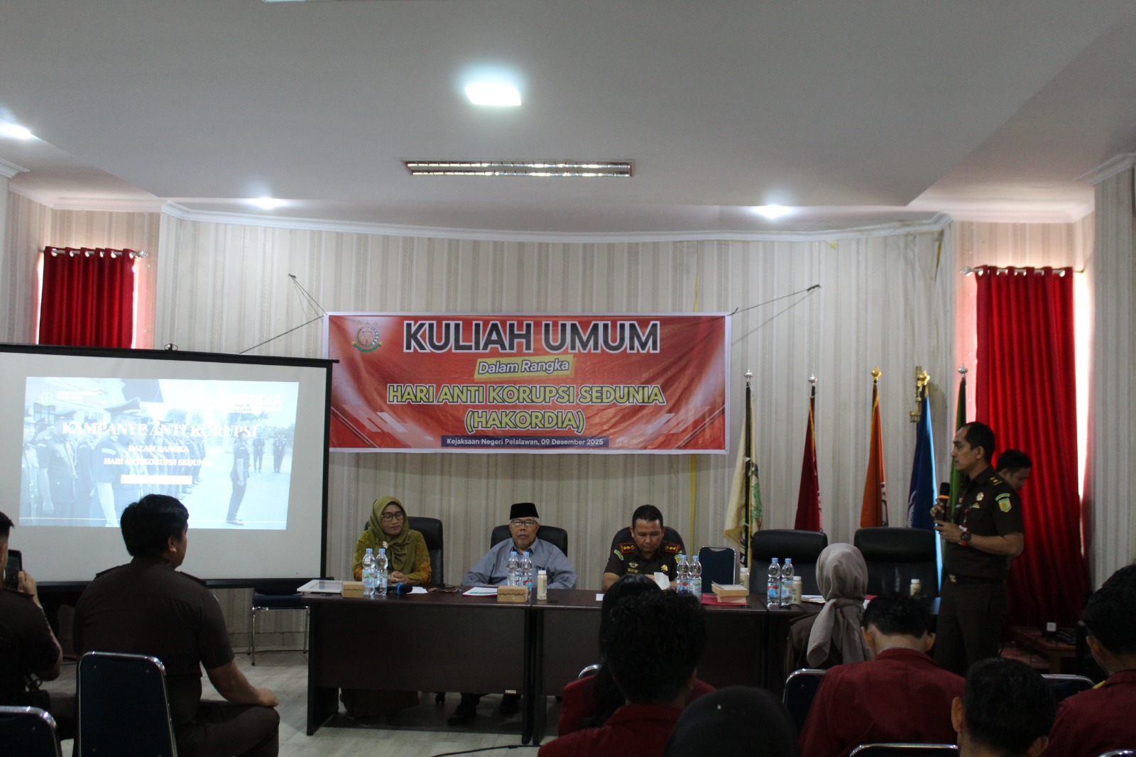 PELALAWAN,CATATANRIAU.COM,— Kejaksaan Negeri (Kejari) Pelalawan melaksanakan kegiatan Kuliah Umum dalam rangka Peringatan Hari Anti Korupsi Sedunia (HAKORDIA) di Institut Teknologi Perkebunan Pelalawan Indonesia (ITP2I), Selasa 9 Desember 2025. Acara yang berlangsung di aula utama kampus tersebut dihadiri langsung oleh Rektor ITP2I, Prof Dr Ir H Tengku Dahril M.Sc, para dosen, serta puluhan mahasiswa dari berbagai program studi yang antusias mengikuti kegiatan.