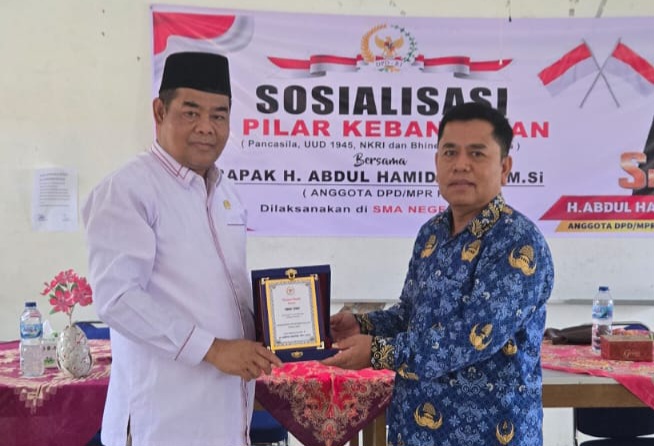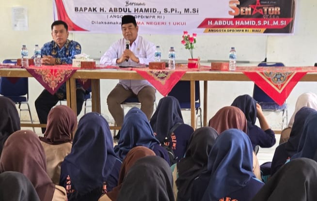 PELALAWAN,CATATANRIAU.COM,— Anggota MPR RI sekaligus DPD RI asal Riau, H. Abdul Hamid, S.Pi., M.Si., memberikan Sosialisasi Empat Pilar Kebangsaan kepada para guru dan 150 siswa-siswi SMA Negeri 1 Ukui, Kamis (18/12/2025). Kegiatan ini berlangsung di SMAN 1 Ukui yang berlokasi di Jalan Lintas Timur, Ukui Dua, Kecamatan Ukui, Kabupaten Pelalawan, sekolah yang berada di wilayah paling timur Kabupaten Pelalawan.