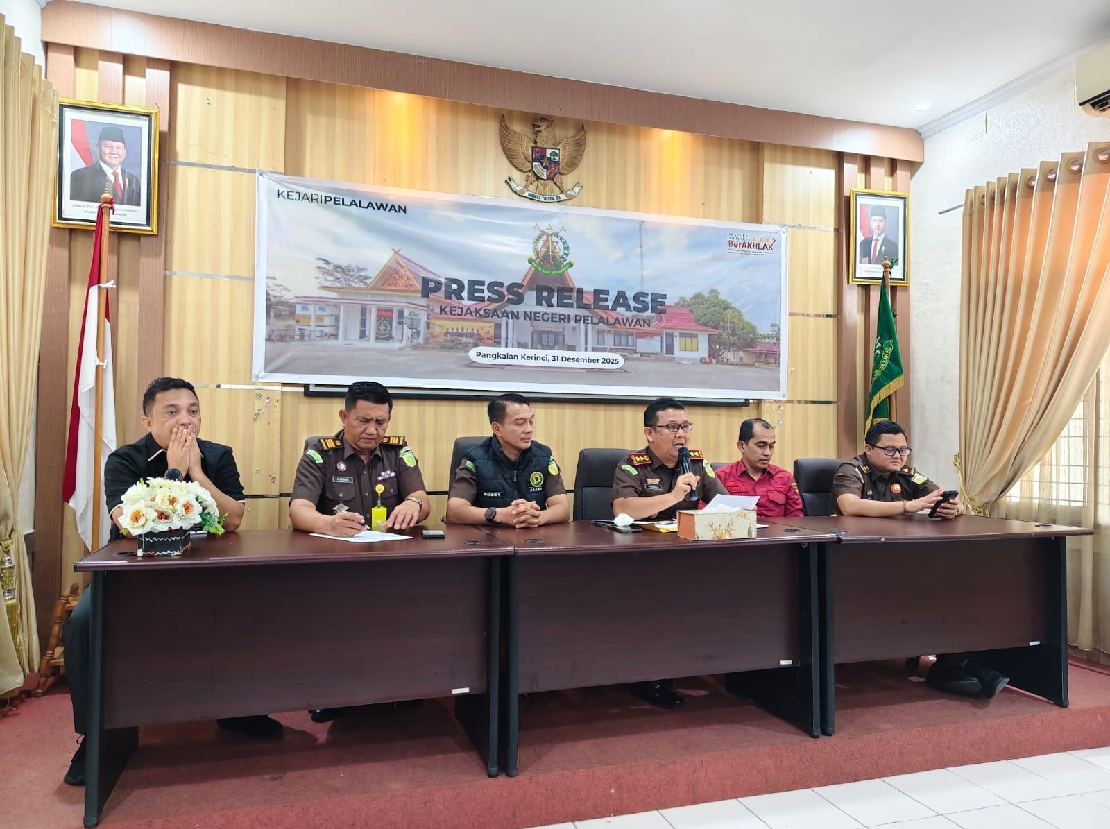 PELALAWAN,CATATANRIAU.COM,– Kepala Kejaksaan Negeri (Kejari) Pelalawan, Siswanto AS, SH, MH, didampingi para kepala seksi, memimpin langsung rilis pers akhir tahun 2025 di Kantor Kejari Pelalawan, Jalan Hangtuah No. 03 SP VI, Desa Makmur, Pangkalan Kerinci, Rabu (31/12/2025). Dalam kesempatan itu, Kajari tampil mantap dan tegas memaparkan capaian kinerja sekaligus perkembangan penanganan perkara strategis yang menjadi perhatian publik.