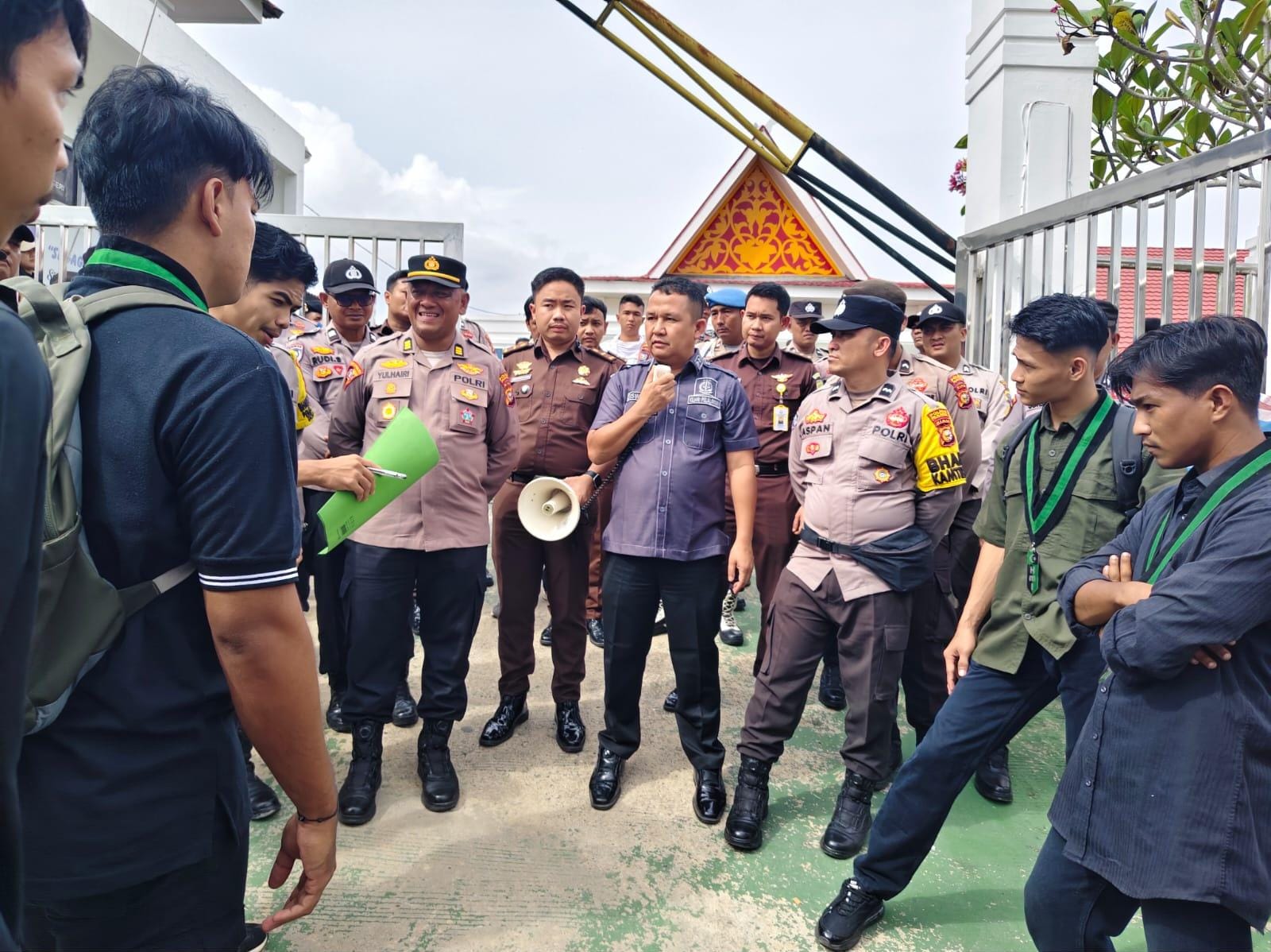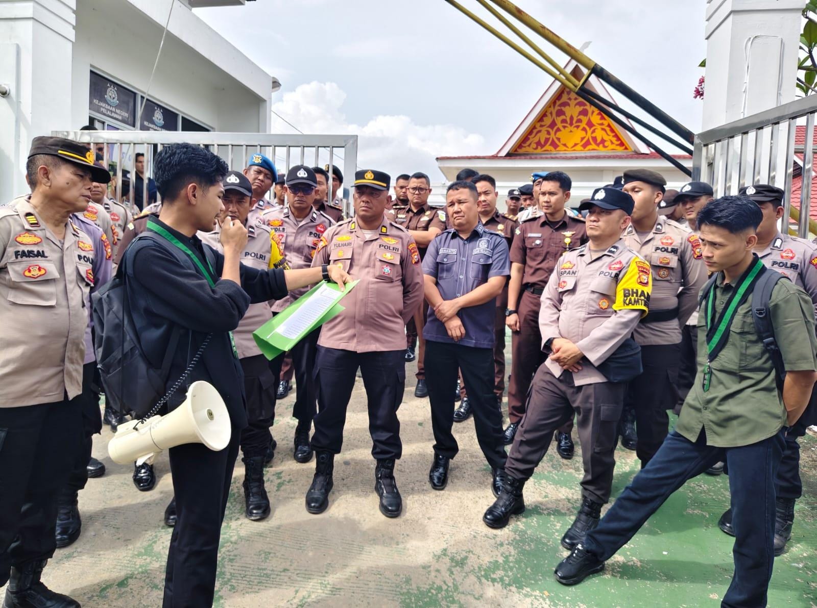 Dalam aksinya, massa membawa berbagai atribut seperti toa, spanduk, poster, dan bendera HMI. Ratusan personel gabungan dari Polri dan TNI terlihat bersiaga di sekitar kantor Kejari Pelalawan untuk memastikan jalannya aksi tetap aman dan terkendali.
