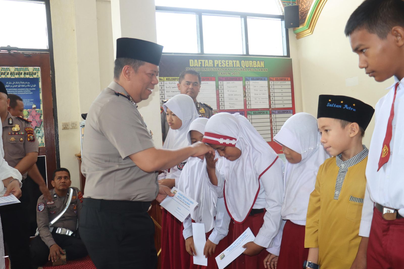 Sebagai bentuk kepedulian sosial, Kapolres Pelalawan secara langsung menyerahkan santunan kepada 15 anak yatim.