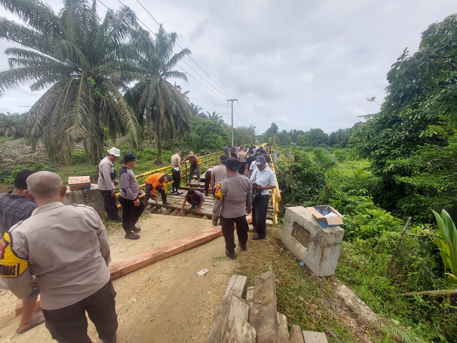 Kapolres Inhu AKBP Eka Ariandy Putra, S.H., S.I.K., M.Si melalui Kapolsek Pasir Penyu Kompol Novia Indra menyampaikan bahwa kegiatan ini merupakan bagian dari upaya Polri dalam mempercepat proses renovasi jembatan demi keselamatan dan kenyamanan masyarakat.
