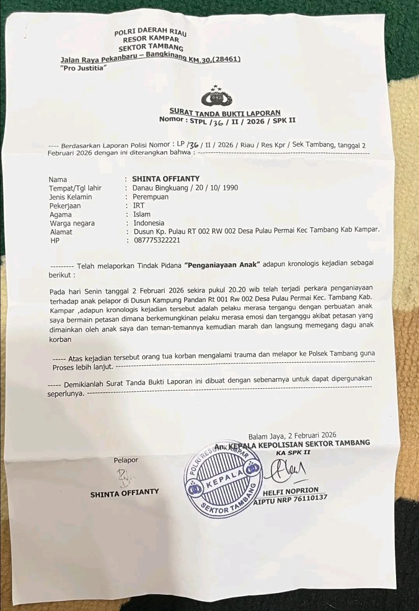 Kampar, Catatanriau.com — Dugaan tindak kekerasan terhadap anak terjadi di Kecamatan Tambang, Kabupaten Kampar. Seorang ibu rumah tangga, Shinta Offianty, melaporkan dugaan penganiayaan yang dialami anaknya ke Polsek Tambang pada Senin, 2 Februari 2026.