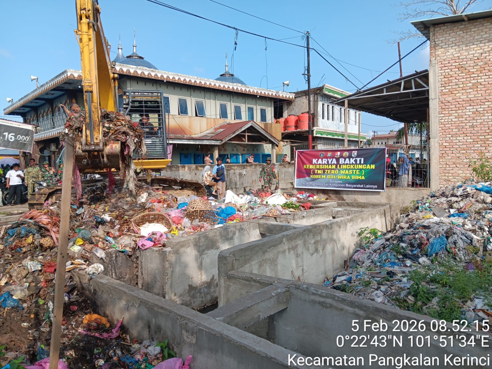 PELALAWAN, CATATANRIAU.COM — Komando Distrik Militer (Kodim) 0313/KPR melaksanakan Kegiatan Karya Bhakti korve/gotong royong massal di lingkungan Pasar Baru Kecamatan Pangkalan Kerinci, Kabupaten Pelalawan, Kamis (5/2/2026). Kegiatan ini digelar dalam rangka mendukung program TNI Zero Waste sebagai upaya nyata mengurangi dampak sampah terhadap kesehatan dan lingkungan.