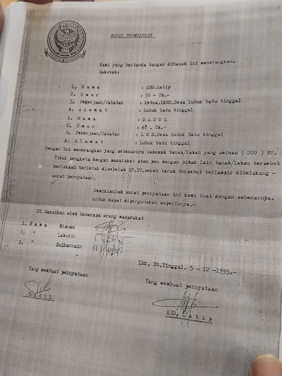 Inhu, Catatanriau.com — Persoalan kepemilikan lahan di Desa Lubuk Batu Tinggal kembali menjadi perhatian publik setelah sejumlah pihak yang mengetahui riwayat tanah tersebut mulai menyampaikan keterangan. Setelah sebelumnya mantan kepala desa dua periode angkat bicara, kini seorang warga yang mengaku pernah melakukan pengukuran langsung di lokasi pada tahun 1995 turut memberikan kesaksian.