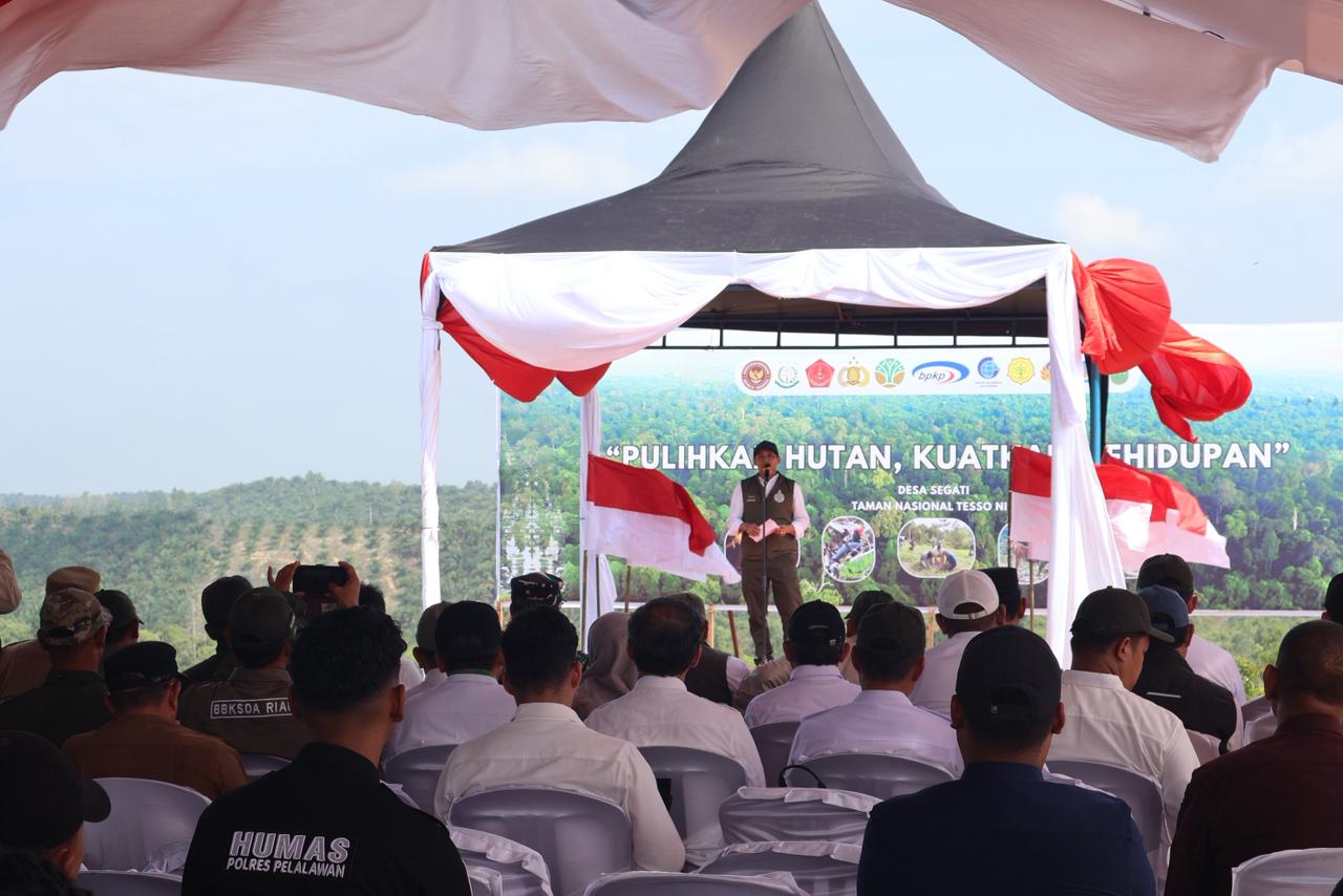 Kegiatan yang dipusatkan di Desa Segati, Kecamatan Langgam, Kabupaten Pelalawan ini turut dihadiri Kapolda Riau Irjen Pol Dr Herry Heryawan SIK MH MHum, Plt Gubernur Riau SF Hariyanto ST MT, serta Bupati Pelalawan H Zukri Misran. Kehadiran para pejabat tinggi tersebut menegaskan komitmen kuat pemerintah dalam menyelamatkan kawasan konservasi yang menjadi paru-paru dunia itu.