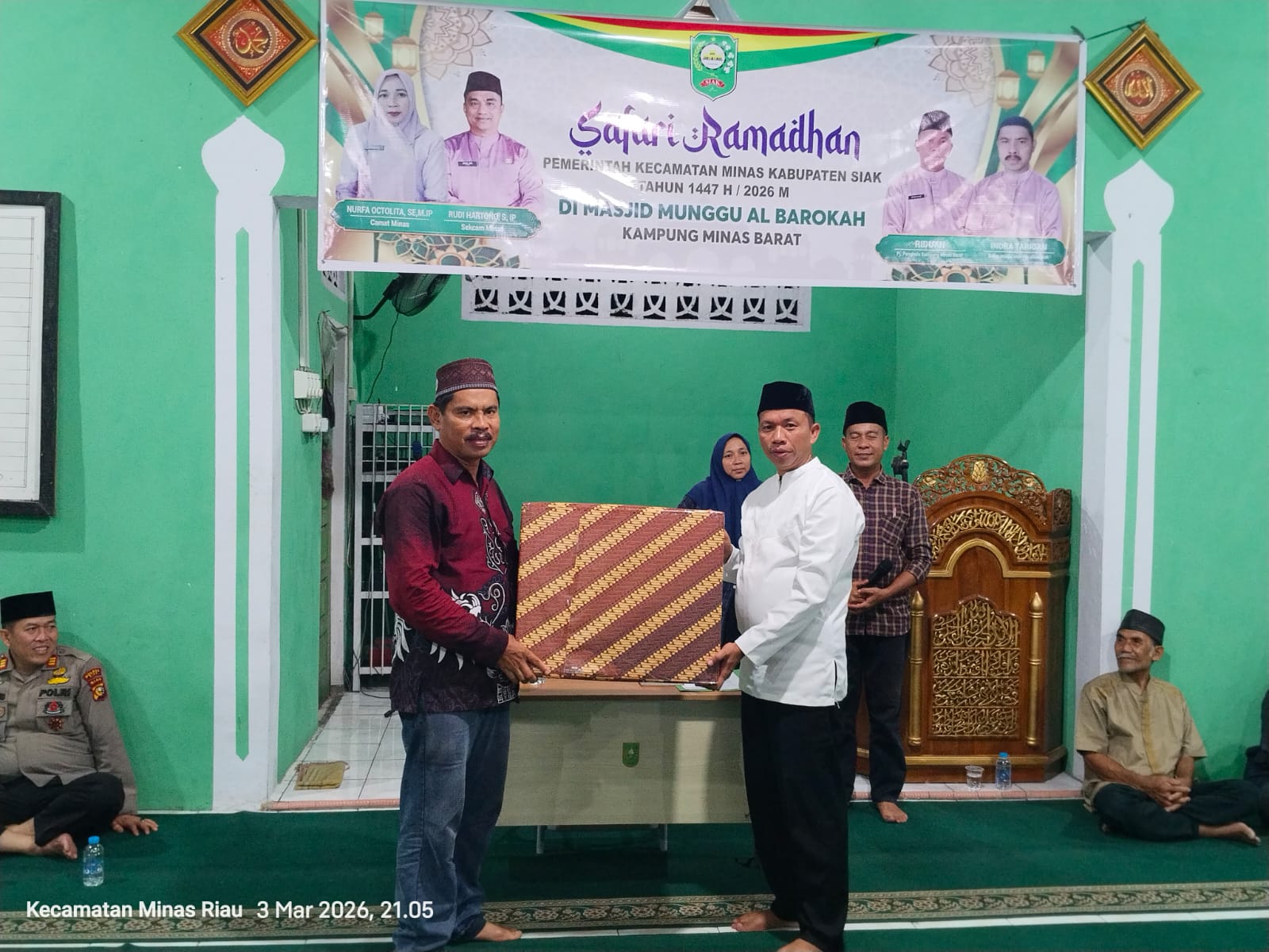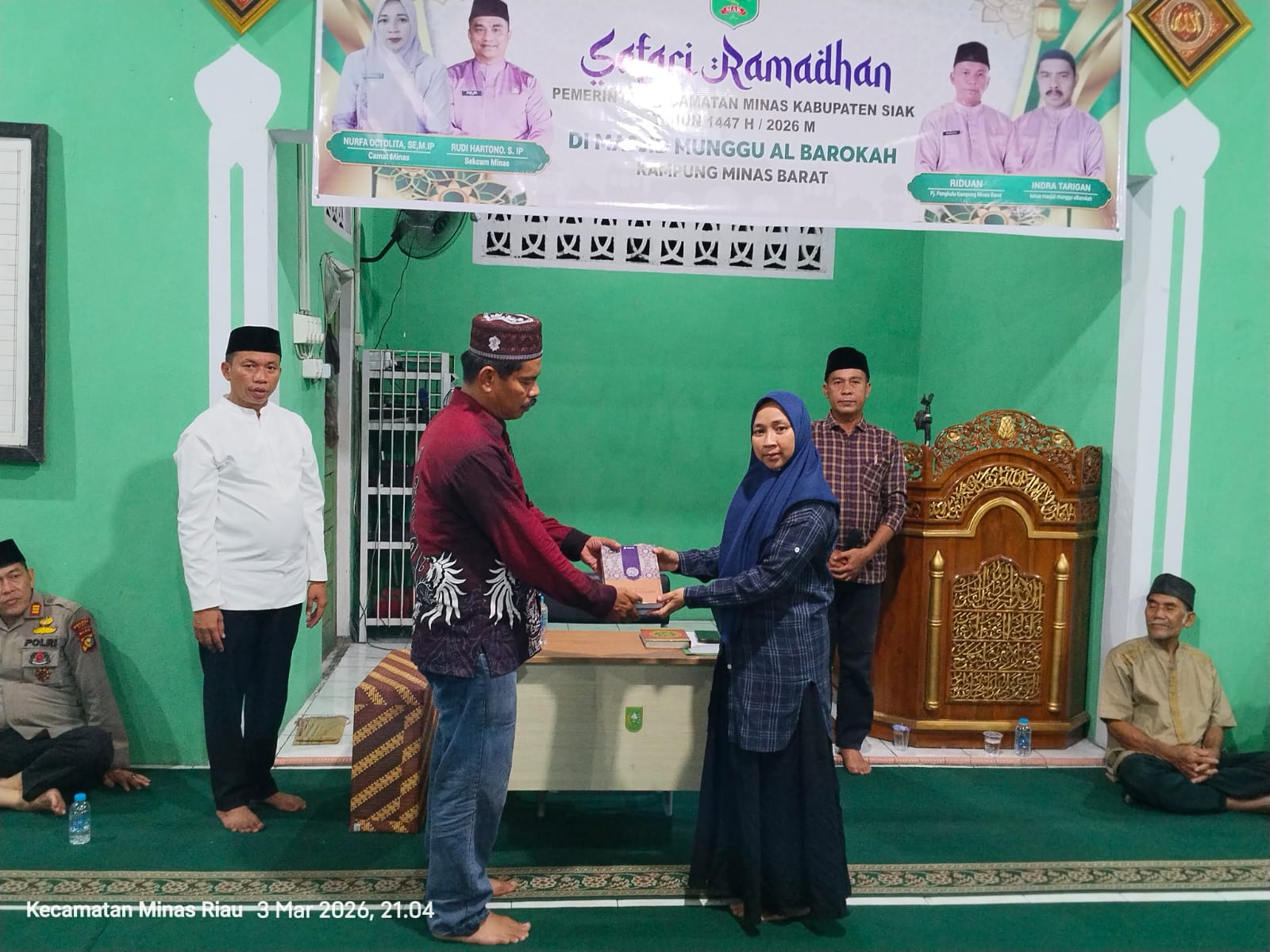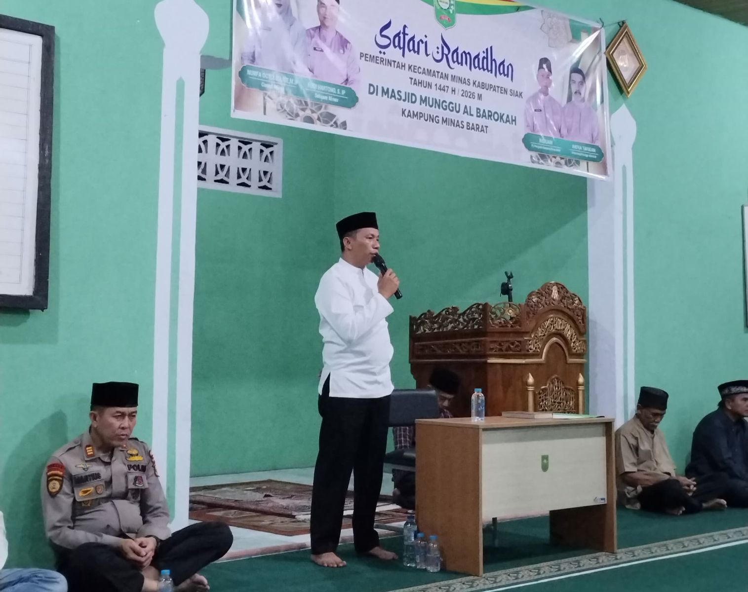 Siak, Catatanriau.com – Pemerintah Kecamatan (Pemcam) Minas menggelar kegiatan Safari Ramadhan 1447 Hijriyah di Masjid Munggu Al Barokah, Kampung Minas Barat, Kecamatan Minas, Kabupaten Siak, Riau, Selasa (3/3/2026) malam. Kegiatan yang dimulai pukul 17.45 WIB ini turut didampingi langsung oleh Pj Penghulu Kampung Minas Barat, Riduan.