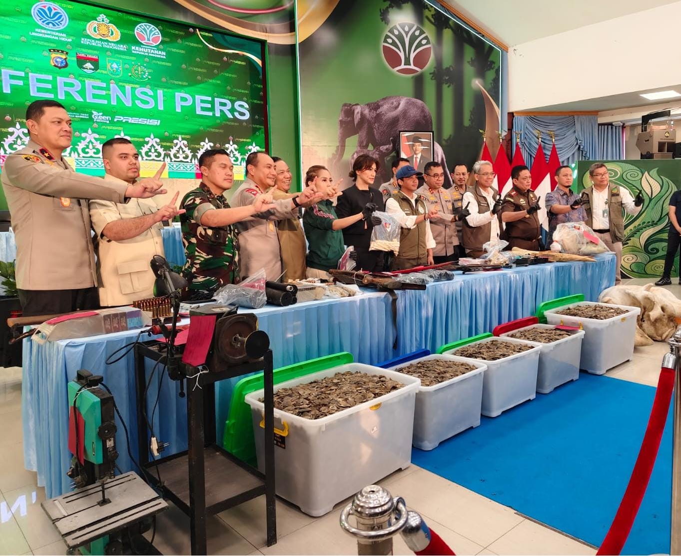 Keterangan Foto: Para pejabat yang pimpin konperensi Pers di Polda Riau menunjukkan barang bukti sitaan sindikat pembunuhan Gajah dan bintang di lindungi, 3 Maret 2026