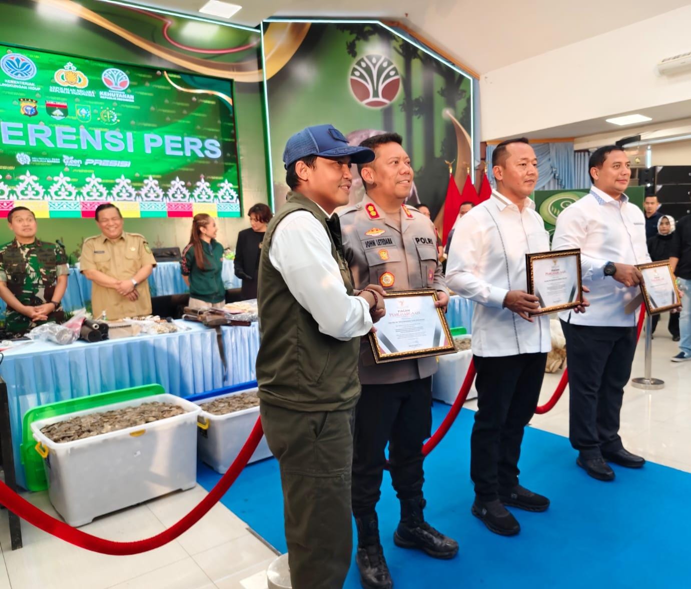 Keterangan Foto: Menteri Kehutanan Republik Indonesia Raja Juli Antony PhD menyerahkan Piagam penghargaan kepada 3 perwira kepolisian yang berhasil pimpin mengungkap sindikat pembunuh Gajah, Selasa 3 Maret 2026