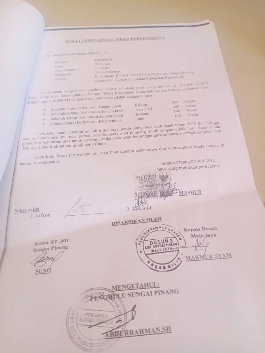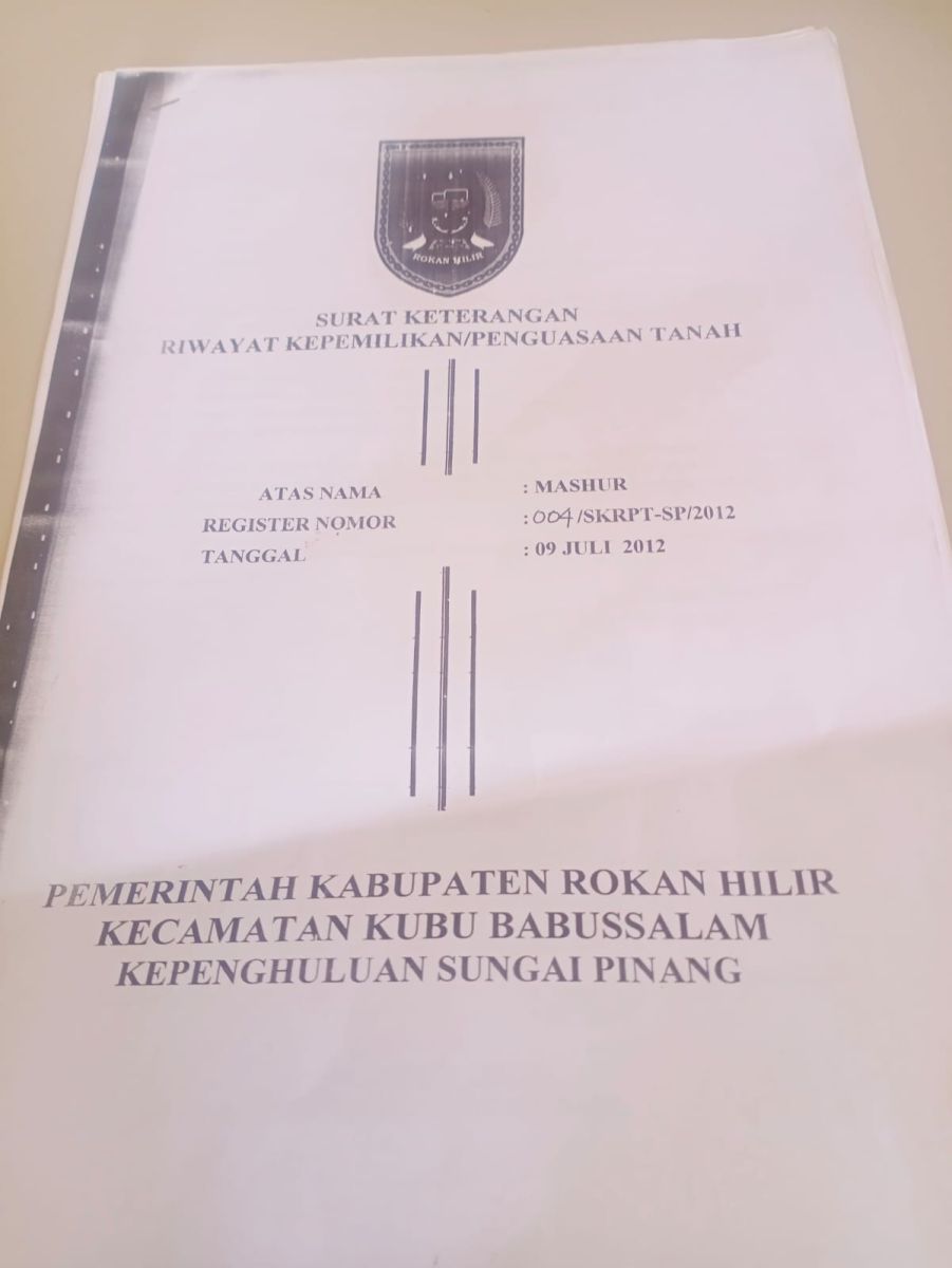 Ia juga menyebutkan bahwa lahan tersebut memiliki dokumen yang dikeluarkan oleh Kepala Desa Sungai Pinang saat itu, Abdurrahman SH, tertanggal 9 Juli 2012.