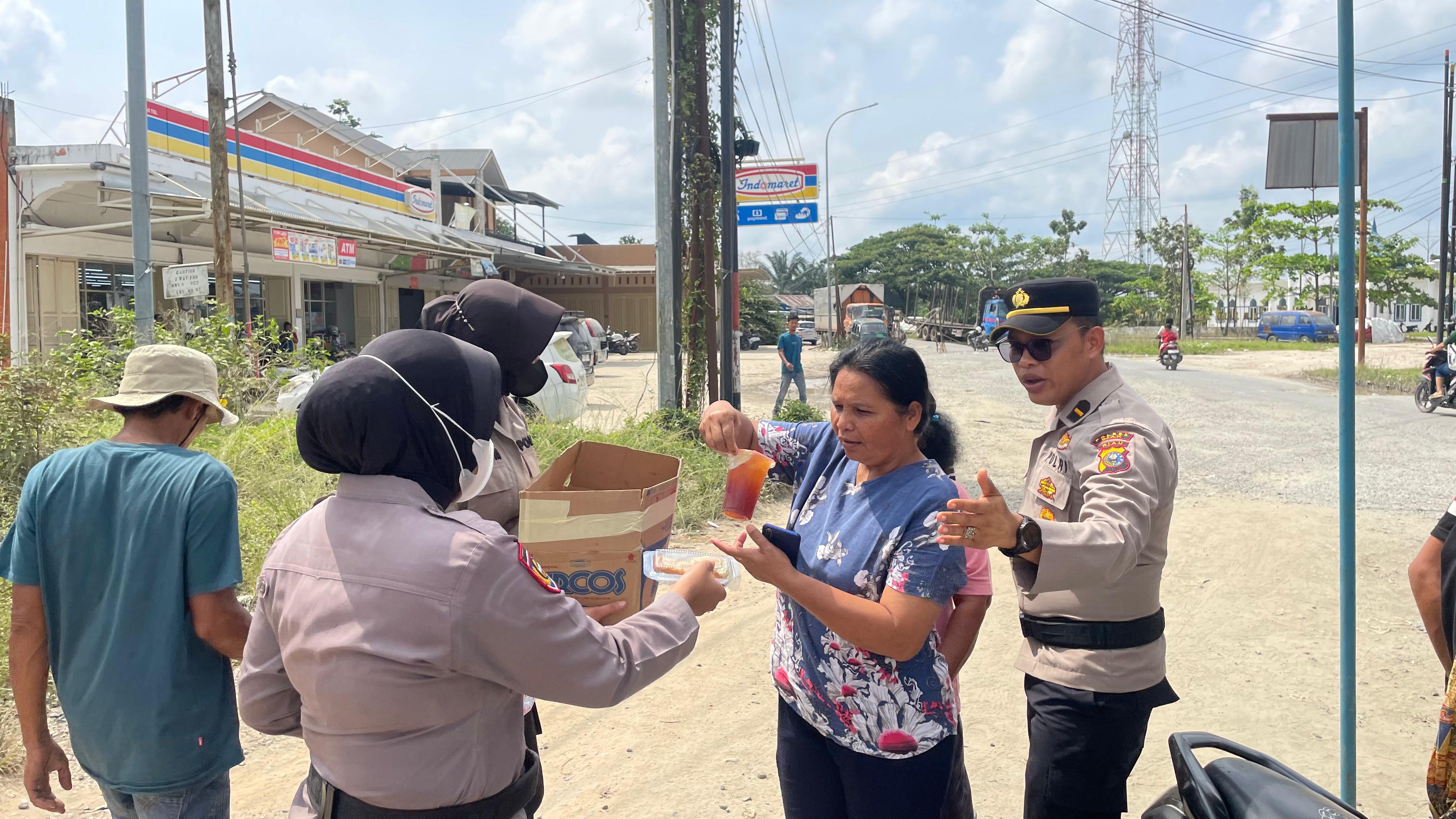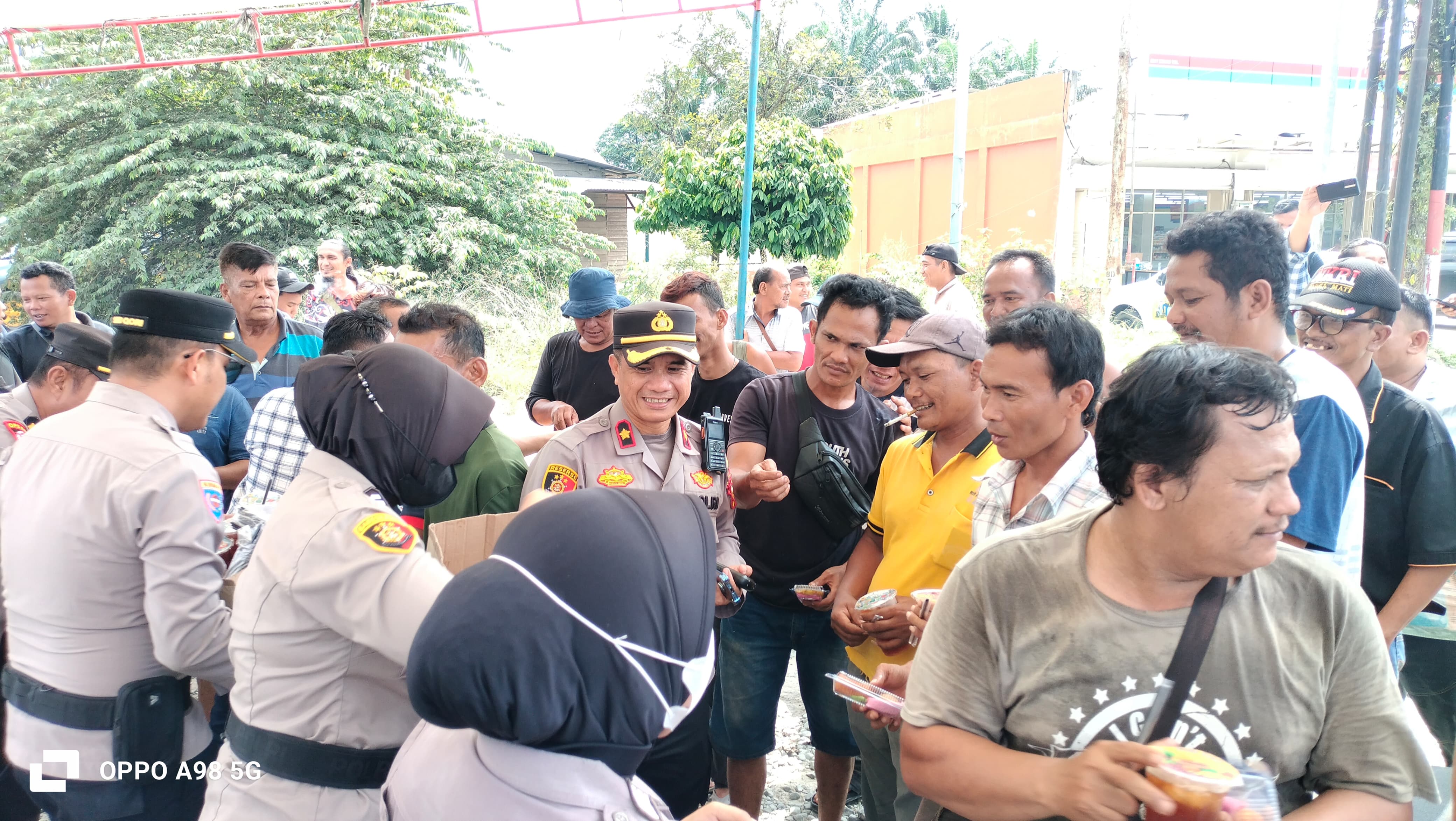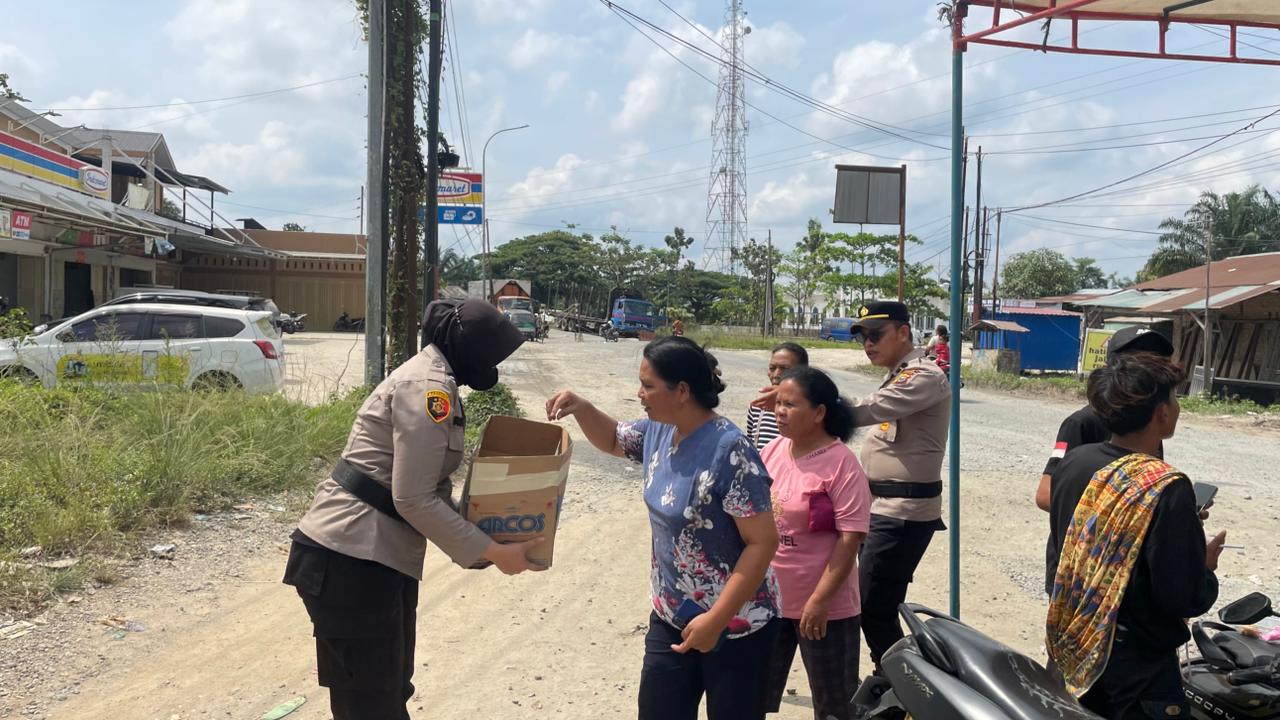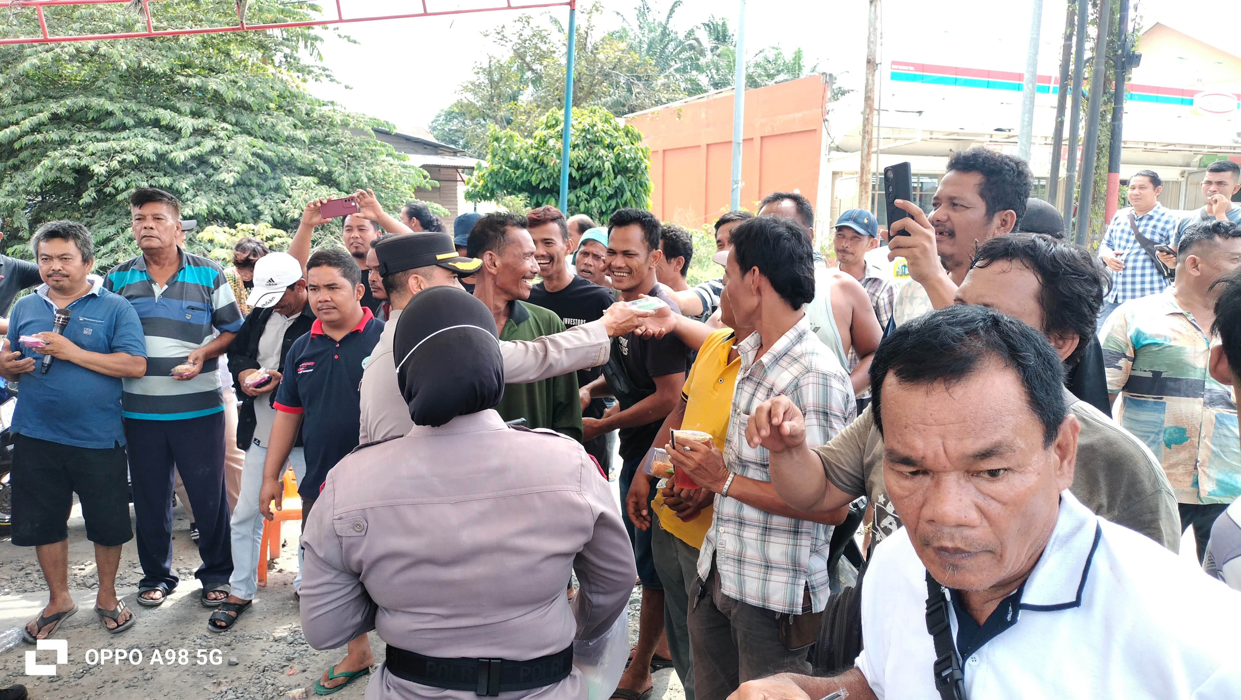 Di tengah dinamika aksi, Kapolsek Minas Kompol Syahrizal menunjukkan pendekatan humanis dengan turun langsung ke tengah massa. Ia bersama personel tampak membagikan kue kepada peserta aksi sebagai upaya membangun komunikasi persuasif dan menjaga situasi tetap kondusif.