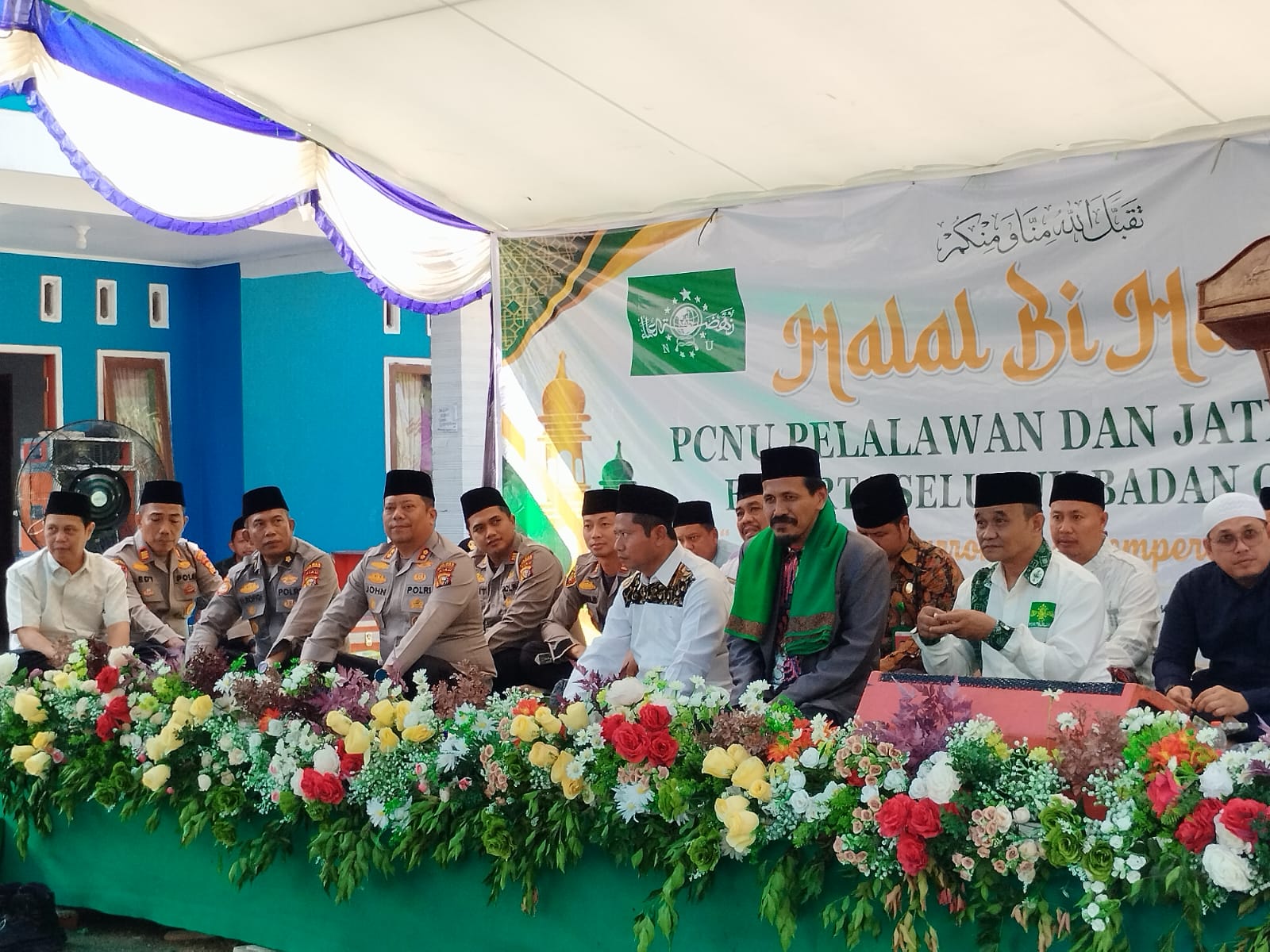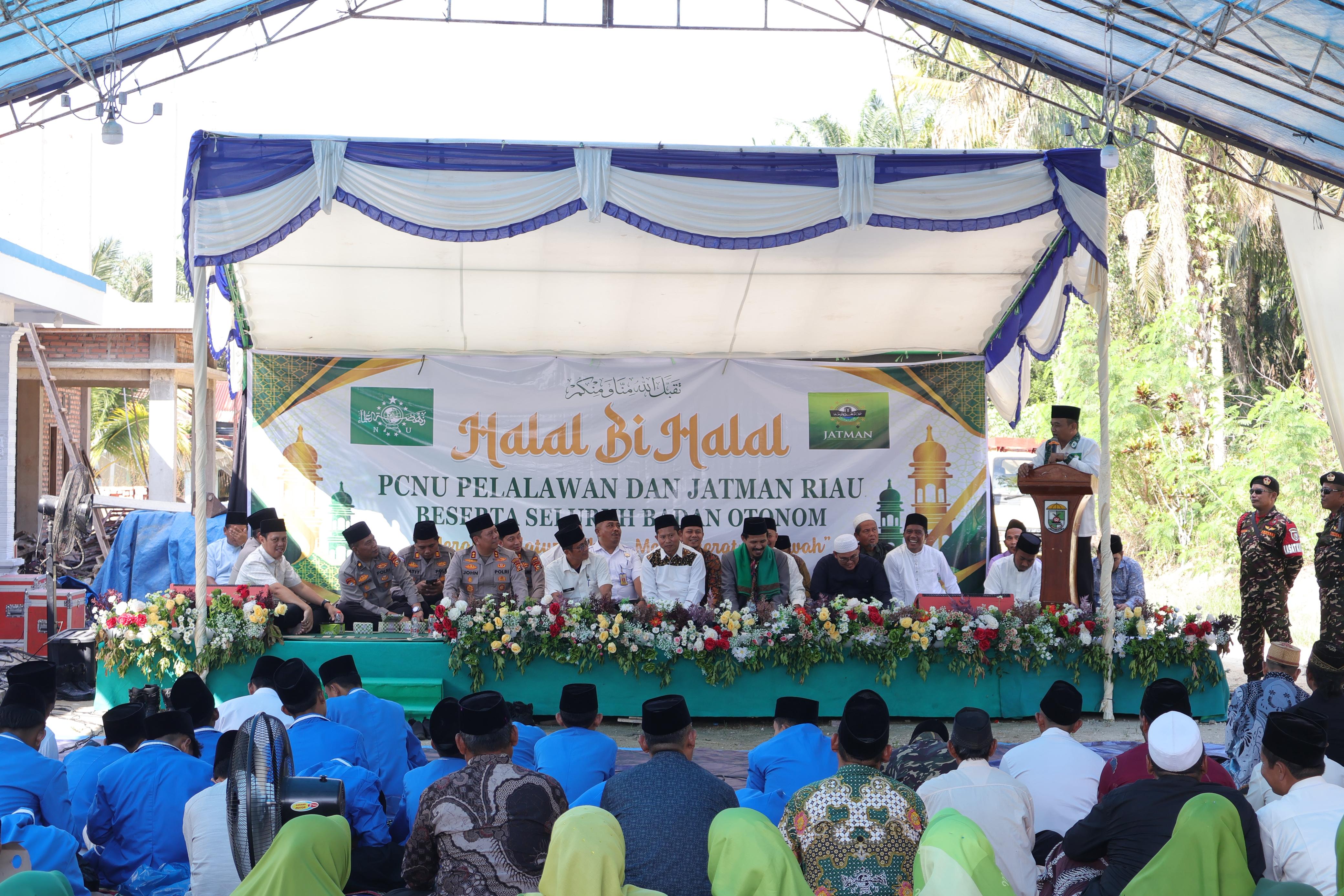 PELALAWAN,CATATAN RIAU.COM,:— Suasana penuh kehangatan dan kebersamaan mewarnai kegiatan Halal Bihalal yang digelar PCNU Kabupaten Pelalawan bersama JATMAN Provinsi Riau di halaman Ponpes Khoirul Ulum, Desa Bukit Jaya, Kecamatan Ukui, Rabu (15/4/2026). Acara ini dihadiri ratusan jamaah serta unsur Forkopimda Kabupaten Pelalawan.