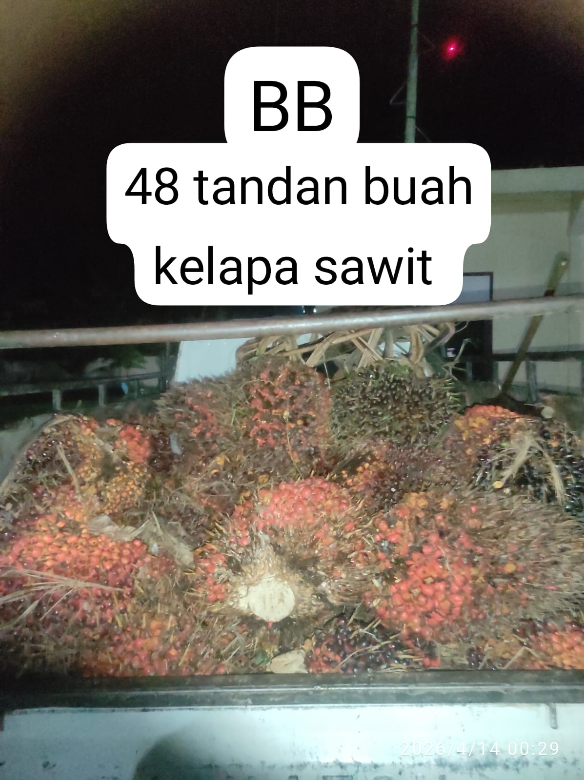 Dari tangan pelaku, polisi mengamankan barang bukti berupa 48 tandan buah kelapa sawit, satu buah egrek, satu unit sepeda motor tanpa nomor polisi, serta kendaraan yang digunakan untuk mengangkut hasil curian.