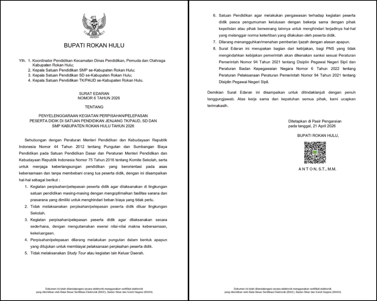 Rohul, Catatanriau.com - Pemerintah kembali menunjukkan komitmennya dalam menciptakan dunia pendidikan yang inklusif, adil, dan tidak memberatkan orang tua peserta didik. Hal tersebut ditegaskan melalui surat edaran Bupati Rokan Hulu Nomor 6 Tahun 2026 yang merujuk pada Peraturan Menteri Pendidikan dan Kebudayaan Republik Indonesia Nomor 44 Tahun 2012 tentang pungutan dan sumbangan biaya pendidikan, serta Nomor 75 Tahun 2016 tentang Komite Sekolah.