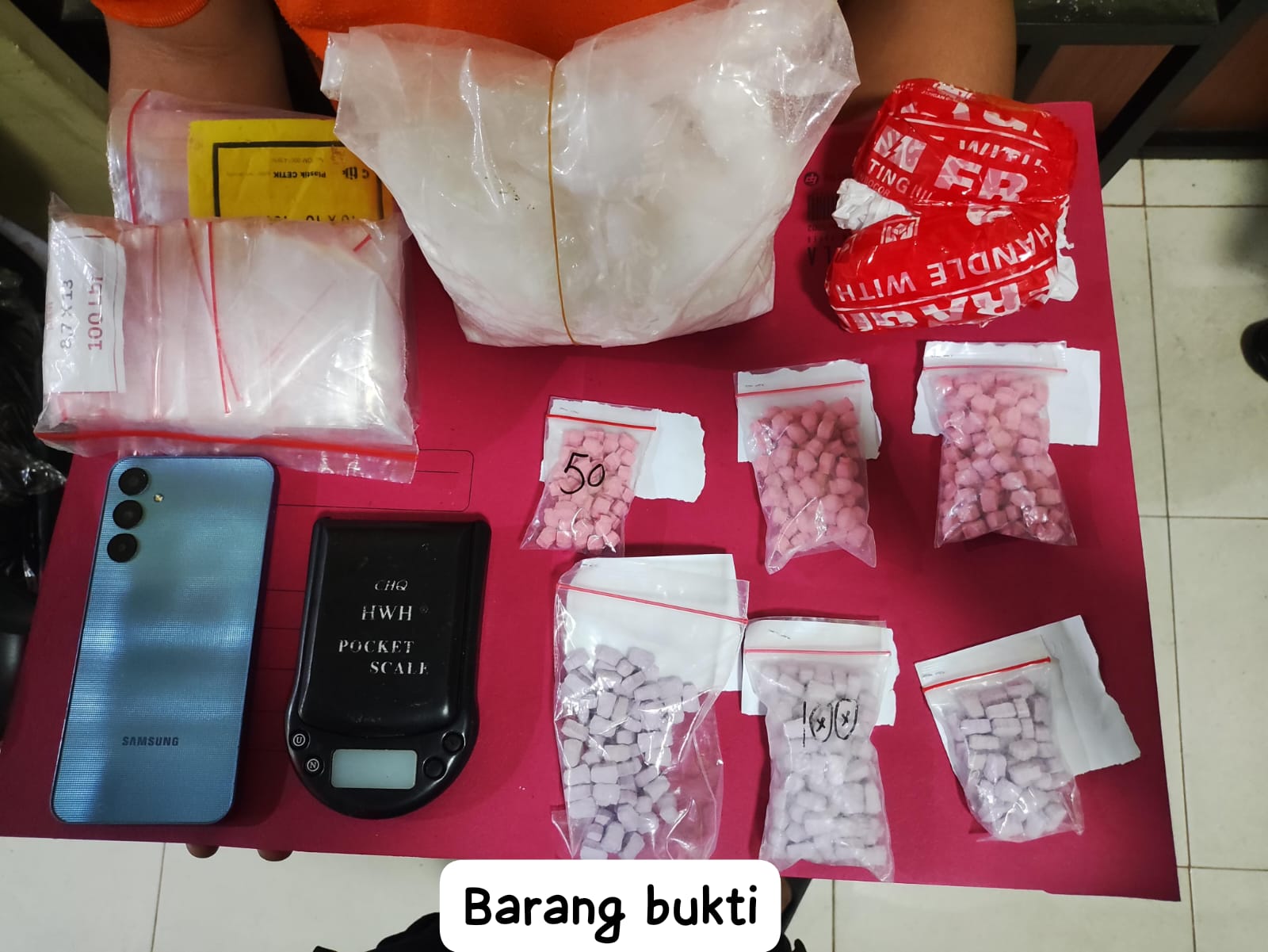 "Di rumah tersangka YI, kami menemukan satu bungkus besar sabu dengan berat kotor mencapai 925,4 gram. Selain itu, ditemukan juga ratusan pil ekstasi dengan bentuk yang unik," ungkap Kapolsek.